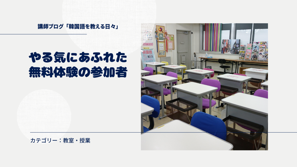今日は昨日の冬空から一転して、日中は青空が広がり、日差しが暖かかったです。そんな中、無料体験に来てくださった方は、無料体験終了後に、その場ですぐに入会を申し込んでくださいましたが、やる気にあふれていて、「韓国ドラマの中で、○○と言っているのは、△△という意味か」と、早速、私に質問なさいました。4月からも、モリモリ勉強なさるのだろうと思います。頑張ってください!無料体験の日時は、こちらになります。皆さんも、ご予約の上、どうぞお気軽にお越しください!