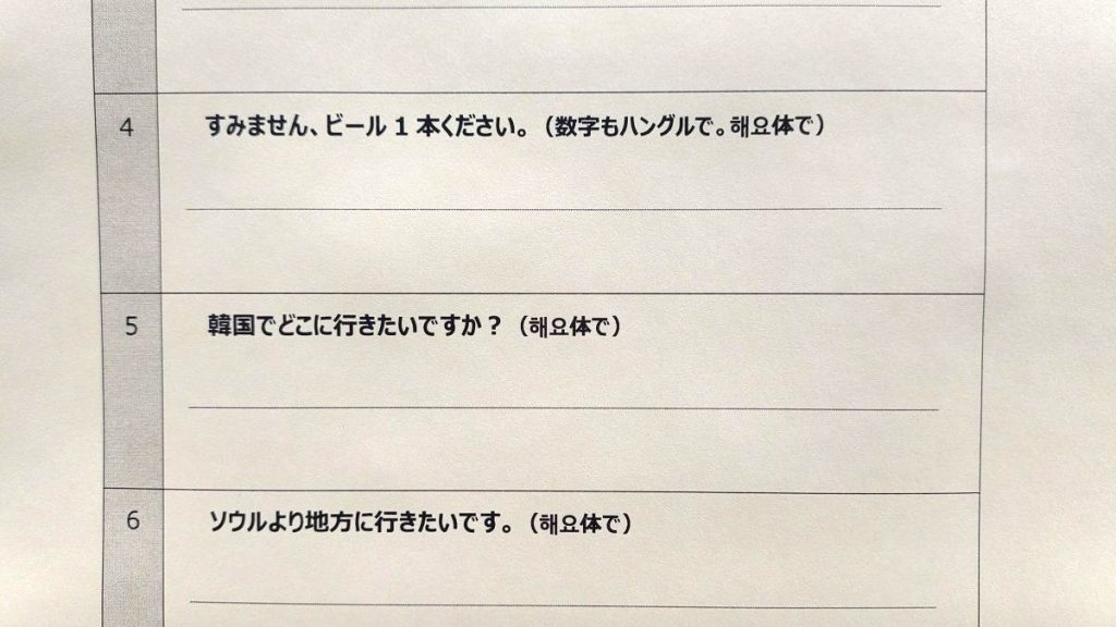 日本語を韓国語に訳して書いていただくのですが、昨年4月に「入門・初級コース」にお入りになって、韓国語をまったくのゼロから学び始めた20~60代の方々が、ほぼ1年が経過して、これぐらいの文を、韓国語でスラスラ書けるようになられました。