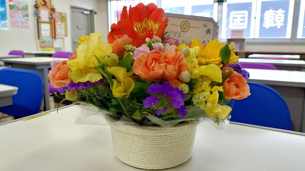 今週は、今年度(2025年度)最後の授業でしたが、「入門・初級コース」の6クラスのうち、1つのクラスの受講生の方々が、お金を出し合って、お花をプレゼントしてくださいました。